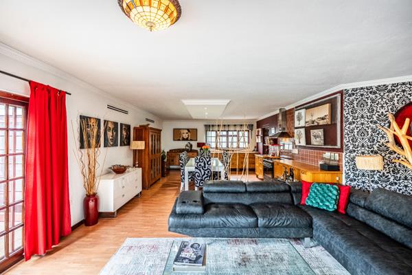 Open-plan living and dining spaces flowing into an entertainment lounge withbuilt-in braai, working space.