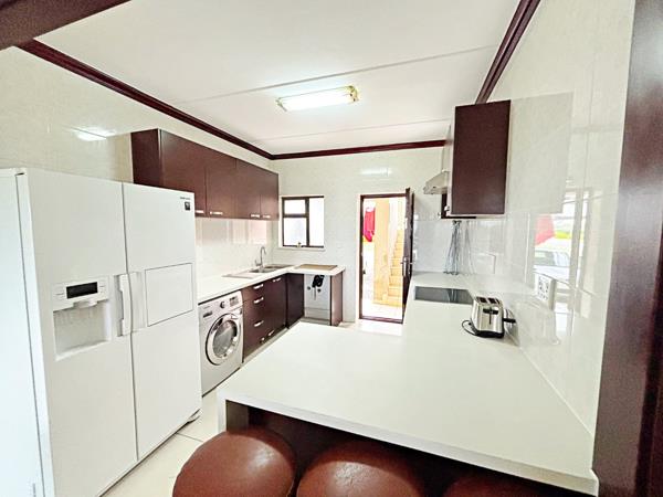 The modern kitchen is as functional as it is stylish, featuring Caesarstone countertops, an electric oven and hob, a convenient breakfast nook, and generous cupboard space ideal for casual meals or culinary creativity.
