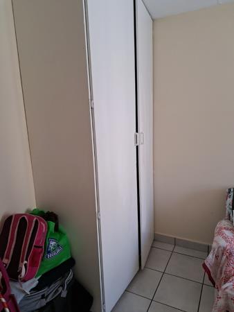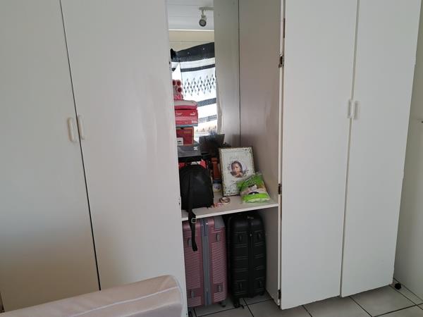 The large sunny, master bedroom has tiled floors, and a large built-in cupboard.