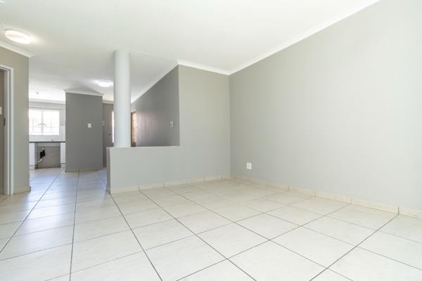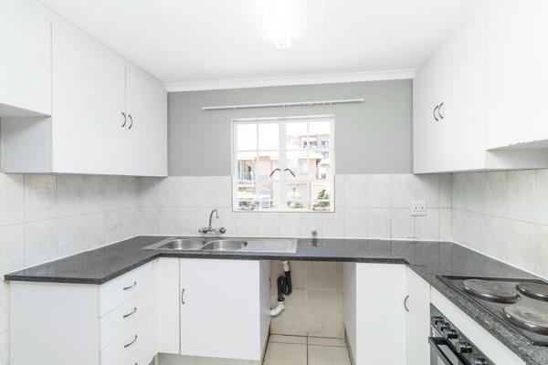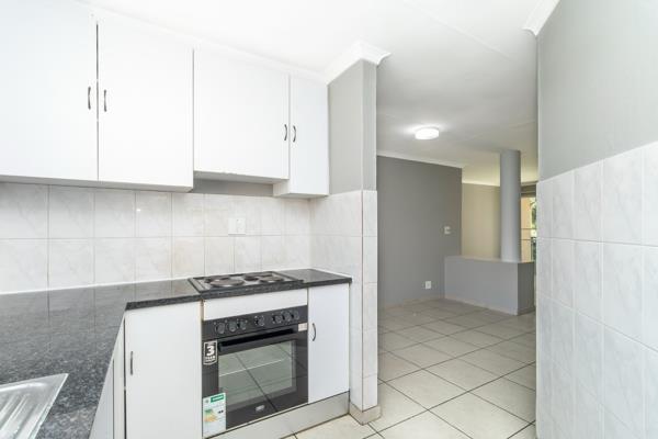Fully tiled 2 bedroom first floor apartment with a stunning kitchen, located at Limnos Village, Vorna Valley, Midrand. Open plan dining/lounge and two bedrooms with built-in cupboards sharing a full bathroom (bath tub and separate shower). Granite kitchen with space for a single fridge and plumbing for a washing machine.