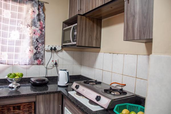 This immaculate ground-floor unit offers a newly renovated kitchen with built-in cupboards and space for a single-door fridge and 1 counter appliance. The spacious open-plan lounge/ dining area is located just off the kitchen.