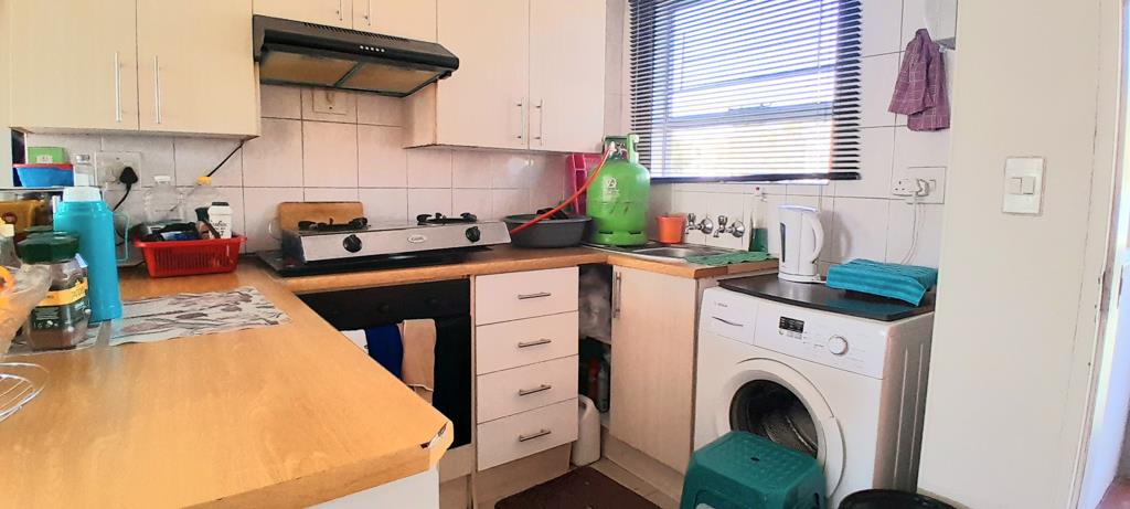 The kitchen with a single sink cupboard and ample built-in cupboards, space for washing machine, single door fridge, and a four plate stove.