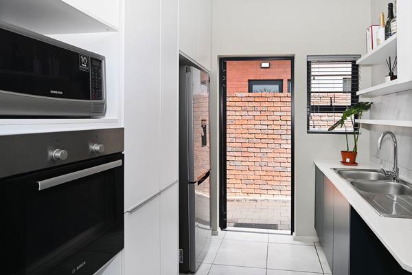 The kitchen is thoughtfully designed, featuring a discreet double sink and a back door that leads to an outdoor washing line. It accommodates both single and double-door refrigerators and includes a built-in gas hob and electric oven, all complemented by ample cupboard and counter space for your small and large appliances.