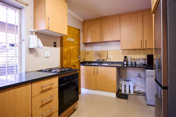 - Open plan kitchen with built in cupboards, oven and stove combination and plumbing for appliances