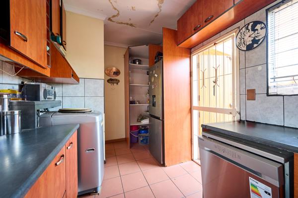 - Kitchen is spacious with ample counter top space, plumbing for 2 appliances, large fridge and pantry cupboard with back door leading to garden and pool.