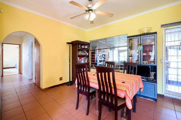 - Dining room opens out onto covered patio that doubles as entertainment room opening out onto the deck with built in braai overlooking the swimming pool and garden.