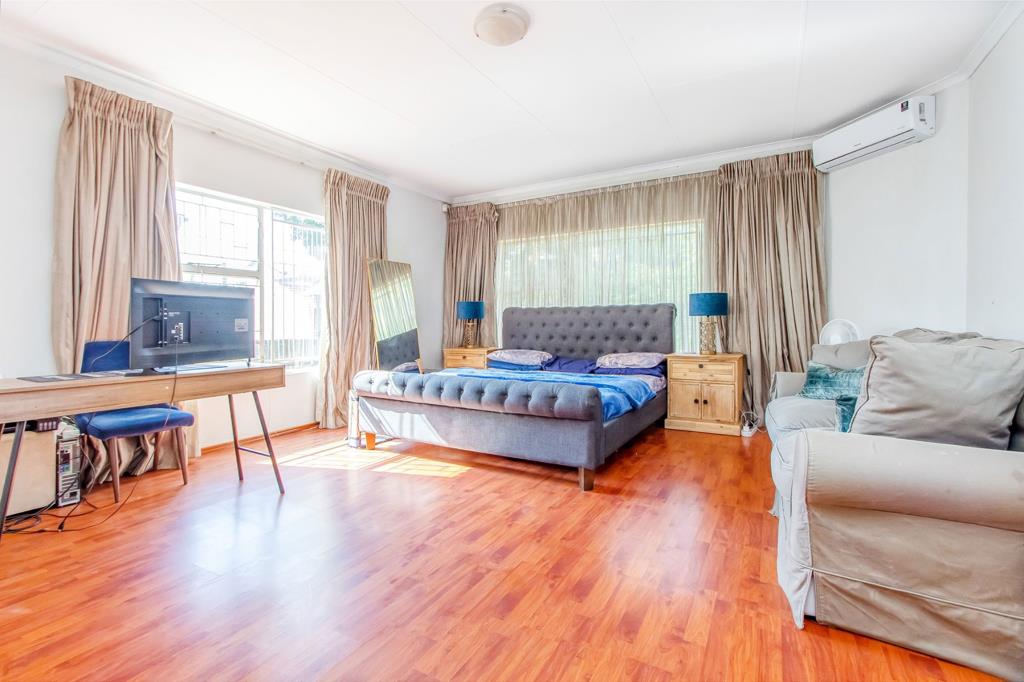 The home features three bedrooms plus a study (or fourth bedroom), all generously sized with excellent natural light. The main bedroom easily accommodates a king-size bed and offers air-conditioning, warm wood laminate flooring, and a modern en-suite bathroom with basin, bath, toilet (with bidet spray), and shower. The additional bedrooms include built-in cupboards and share a functional, naturally lit bathroom with contemporary finishes.