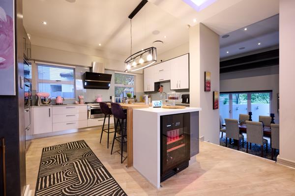 At the heart of the home lies the designer kitchen: sleek and shiny cabinetry surrounds the wood and quartz topped island, with integrated appliances including a fridge-freezer, microwave, gas hob and undercounter oven. A dedicated coffee station provides convenience and additional storage. Sliding doors connect the kitchen to the covered patio, fitted with a wood-gas braai, overlooking the heated lap pool that is partially covered for all weather enjoyment.