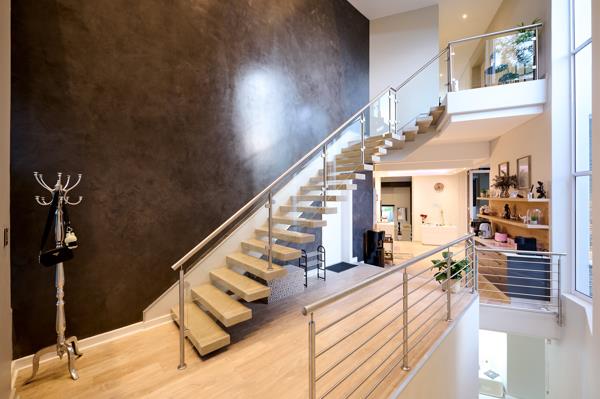 One more level up, the third bedroom is accessed over the striking glass walkway a bright and private retreat with a balcony and views, as well as a spiral staircase leading to a games room, or study below that opens to the garden with views over the greenbelt and river. The full en-suite is filled with natural light, and features a dramatic glass floor panel a unique touch.