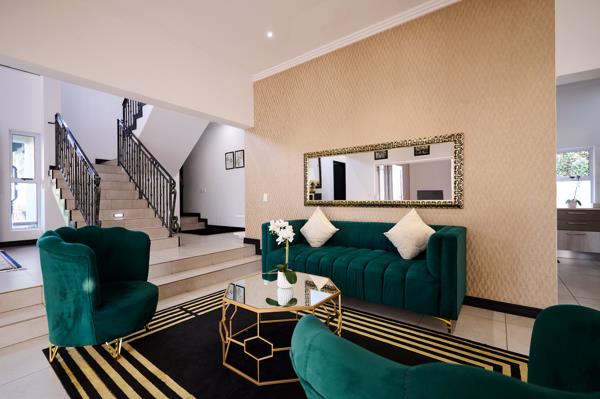 A serene water feature at the entrance sets a tranquil tone, central to the double and single garages. Within the double volume entrance, you are greeted by a spacious open plan living area, encompassing lounge, TV lounge and dining areas, all warmed by a gas fireplace. Stacking doors open to the wide enclosed patio, extending the living area and offering many entertaining options. The patio includes a built-in braai, with a serving counter, sink and cupboards, and overlooks the heated pool nestling in the corner of the lush garden.