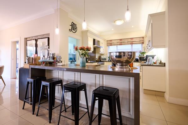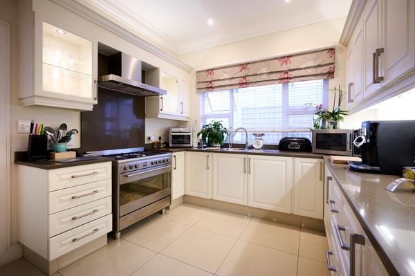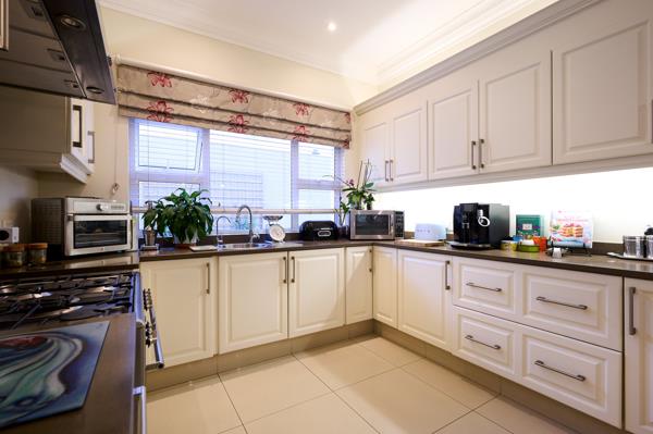 The heart of the home, the kitchen, is as stylish as it is functional with white cabinetry, dark stone counters, SMEG gas-electric cooker, walk-in pantry, and scullery. A well-appointed staff suite with kitchenette and en-suite ensures every lifestyle need is met.