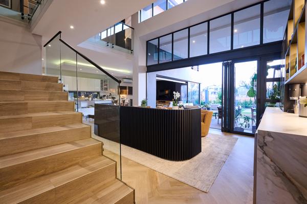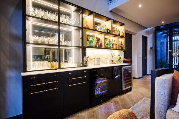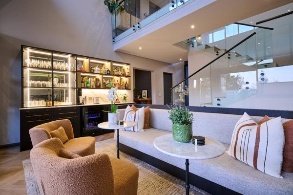 The dining area, complete with a chic built-in bar featuring backlit display shelves and dual wine and beverage coolers, connects effortlessly to the covered patio through stacking doors perfect for entertaining. The Martin Meyer kitchen is a statement in refinement, centred around the stone-topped island with an integrated SMEG cooker. Glossy cabinetry, a walk-in pantry, and a separate scullery ensure both style and function.