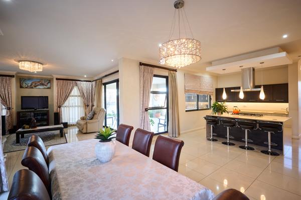 Set on a corner plot with excellent off-street parking, the home features a double garage with the entrance conveniently located to the side. Inside, the open plan living area is bright and welcoming, glossy pale tiles amplifying the natural light. The spacious lounge opens through sliding doors onto the covered patio, creating a seamless flow between indoor and outdoor living. The dining area overlooks the garden, connecting to the kitchen.