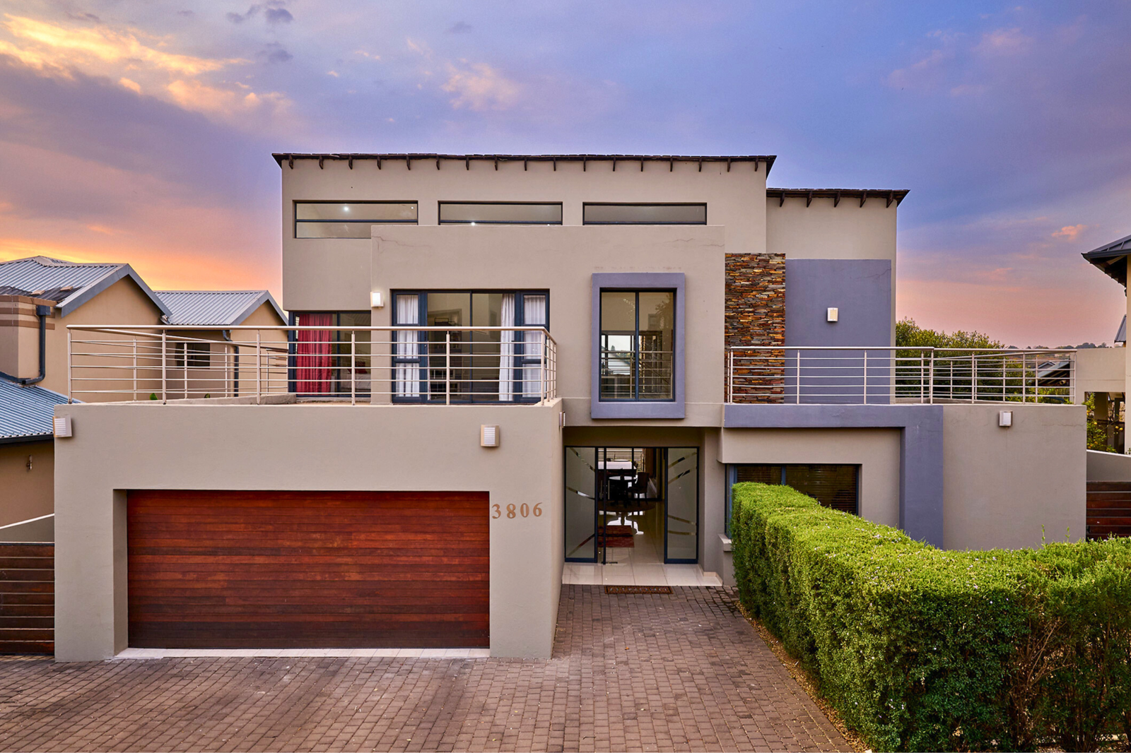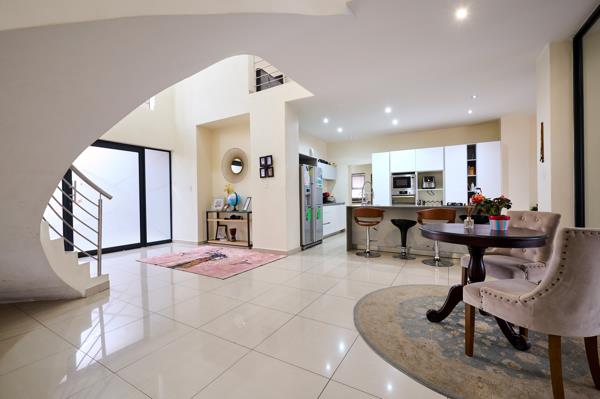 Bright and airy, and designed for easy family living, this modern home combines generous proportions with stylish features, offering excellent potential. Natural rock accents and single pitch rooflines give it distinctive architectural appeal, while the double volume entrance hall anchored by an elegant curving staircase sets the tone for spacious interiors. Glossy pale tiling flows throughout the open plan living spaces, enhancing light and continuity.