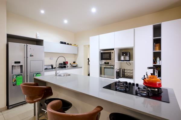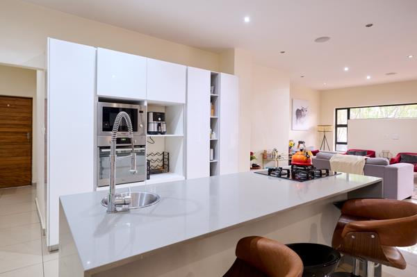 The private, carpeted study is conveniently located off the entrance, ideal for working from home. The heart of the home is the modern kitchen, finished with crisp white cabinetry and pale grey stone counters. A central island with seating incorporates the gas hob, while eye-level ovens, a walk-in pantry, and a separate scullery provide both convenience and functionality.