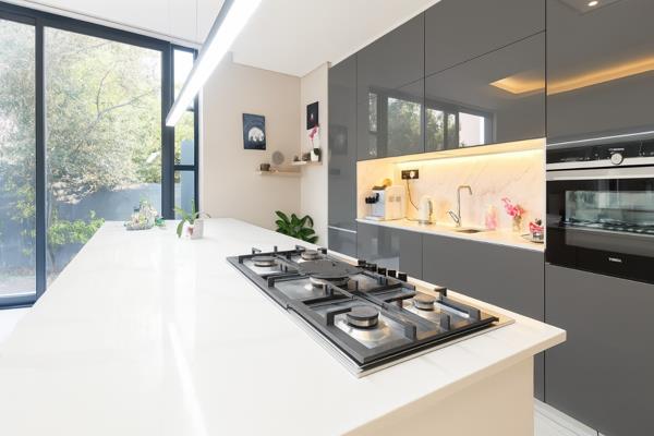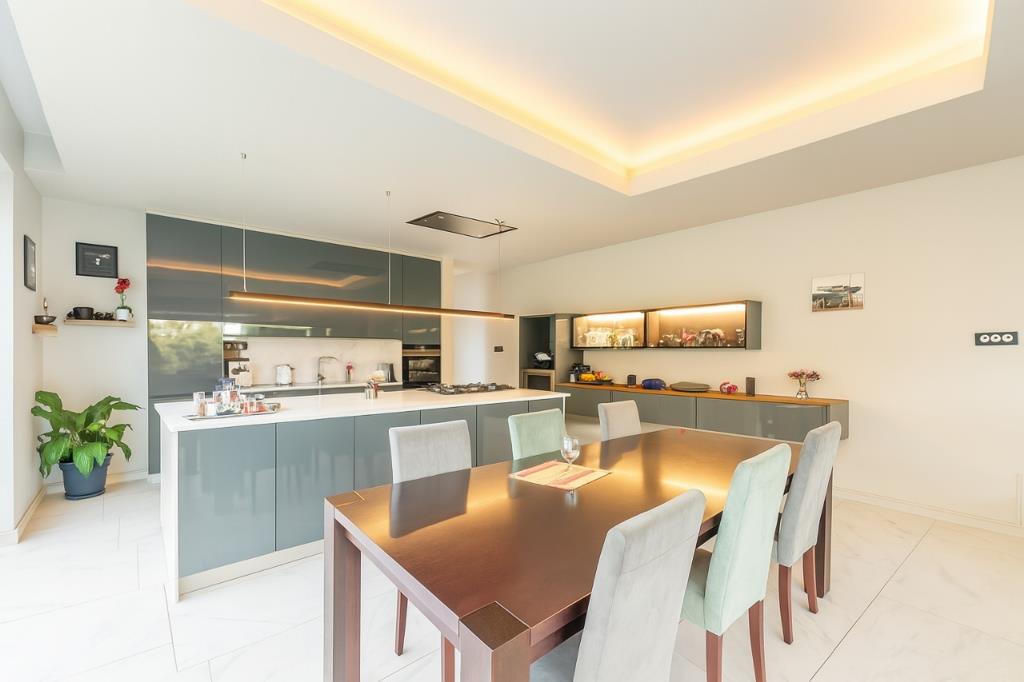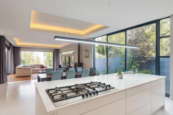 The heart of this home is its magnificent open-plan design, seamlessly integrating the living, dining, and kitchen areas. Floor-to-ceiling windows invite abundant natural light and offer picturesque garden views, enhancing the sense of space and connection to nature. The bespoke kitchen is a culinary dream, boasting sleek grey high-gloss cabinetry, pristine white countertops, integrated appliances, and a generous island with a gas hob. Modern lighting, including recessed and pendant fixtures, illuminates the space, while a contemporary fireplace and a stylish exposed concrete ceiling add an industrial-chic edge to the sophisticated ambiance.