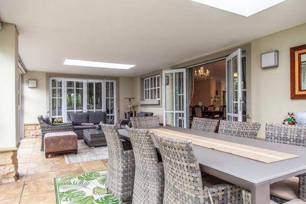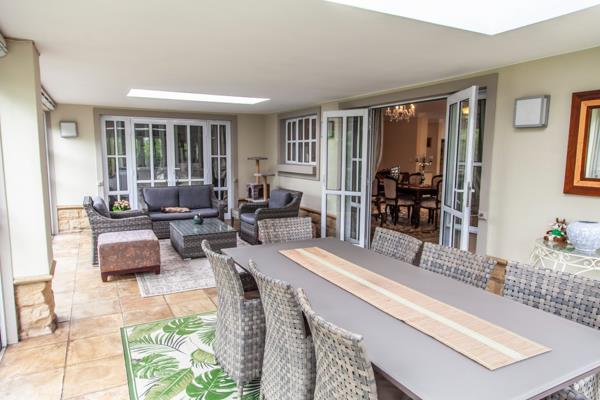 The patio itself is impressively large and surrounded by stacking doors, ideal for relaxed gatherings or just enjoying some quiet time.