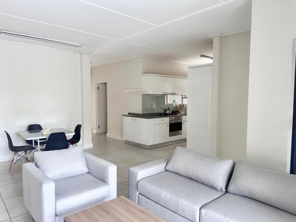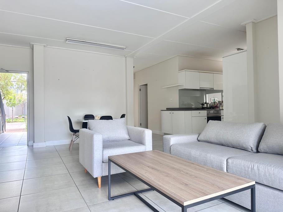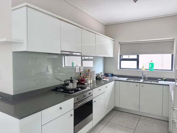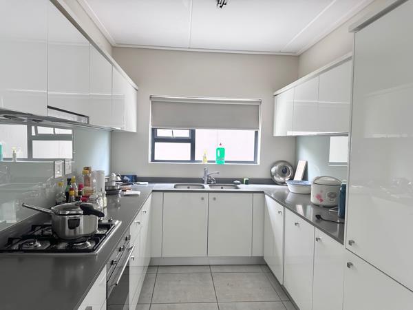 This modern home features an open-plan living and dining area that flows seamlessly into a sleek, fully-equipped kitchen with ample storage.