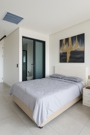 The open-plan lounge is designed to feel spacious and versatile, giving you the freedom to create the kind of living space that matches your personality whether you prefer a cosy setup for evenings in, or an inviting area for hosting people your age. Large sliding doors draw you toward the private balcony, offering a refreshing view across the estate. Not lagoon-facing, but perfectly positioned for days when you want peace, quiet and privacy.