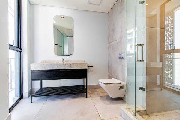 Experience the pinnacle of urban luxury in this magnificent 3-bedroom, 3.5-bath penthouse boasting panoramic views and sophisticated modern finishes. High ceilings and eco-friendly design elements create an airy, elegant atmosphere throughout. The expansive open-plan living and dining areas flow seamlessly onto a large covered private balcony through double sliding doors, offering uninterrupted vistas of Gauteng and the bustling Waterfall City skyline below.