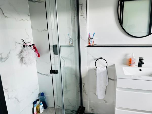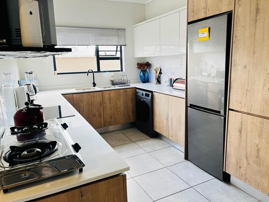 The interior of this contemporary home is meticulously designed for comfort and functionality. The modern kitchen showcases elegant two-tone cabinetry, sleek finishes, integrated appliances, and pristine white countertops. Open-plan living and dining areas are bathed in natural light, featuring durable tiled flooring and large sliding glass doors connecting to a private patio. Accommodation includes three well-appointed bedrooms, with the master suite featuring an en-suite bathroom. Both bathrooms are finished to a high standard with contemporary designs and practical vanity storage. Essential modern conveniences include fibre connectivity and two dedicated parking bays. Pets are permitted, and the property features a garden. Located in the desirable Waterfall area of Midrand, South Africa, this residence offers a refined and secure lifestyle within a vibrant community.