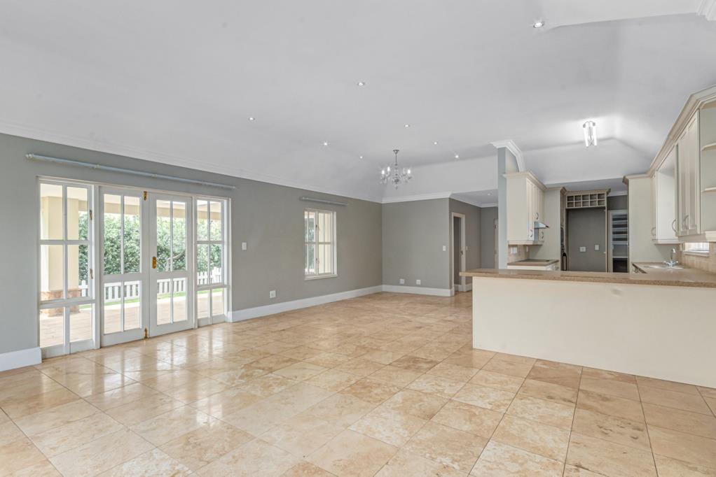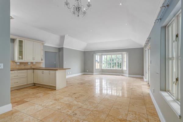 Spacious, open-plan design of the living room, dining room and kitchen, french doors that open onto the large private patio and lovely garden.