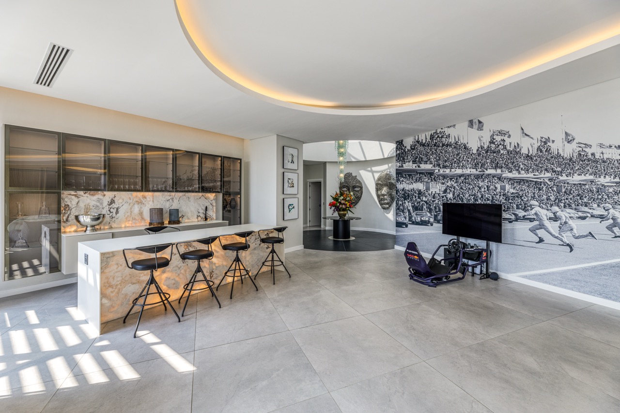Designed for effortless entertaining and ultimate relaxation, the home features both formal and informal lounge and dining areas, as well as inside and outside bars perfect for hosting guests or enjoying quiet evenings in style. Stephen Pikus chandeliers and original artworks by Ramrutha Makoba add bespoke artistic flair, elevating the space with character and elegance.