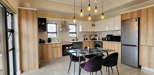 Step inside to discover an inviting open-plan layout, where a modern, fully equipped kitchen takes center stage. Featuring high-quality Defy appliances, ample cabinetry, and contemporary finishes, the kitchen flows effortlessly into the spacious living and dining area. A beautifully crafted wood accent wall adds a touch of warmth and sophistication to the living space.