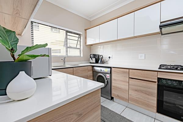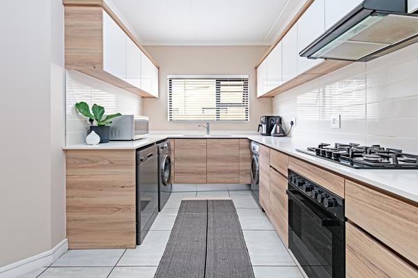 The open-plan dining and lounge area features a sleek air conditioner and automated curtain opener, creating a cool and convenient space to relax or entertain. The modern kitchen is a standout fully equipped with a gas stove, hob, oven, and space for three appliances (all of which stay!).