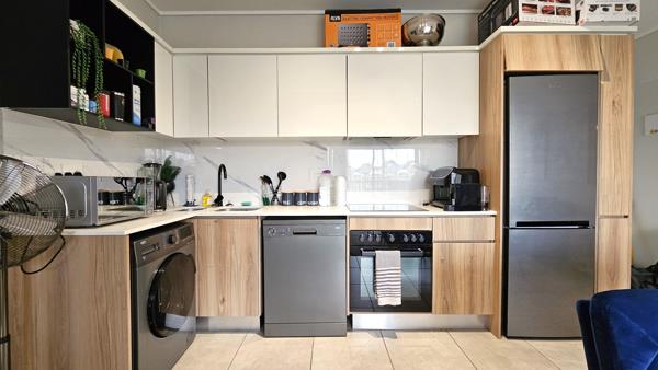 Abundant natural light floods the living space through large sliding doors, leading to a private balcony. The kitchen is thoughtfully designed with modern, two-tone cabinetry, integrated appliances including a fridge, washing machine, dishwasher, oven, and hob, complemented by a stylish marble-patterned backsplash. Tiled flooring throughout ensures easy maintenance and a clean aesthetic, enhancing the sense of space and flow ideal for modern living.