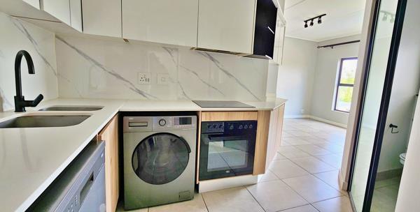 The stylish kitchen is thoughtfully designed and fully equipped with integrated appliances, including a washerdryer combo, dishwasher, fridge-freezer, and an electric stove with hob, complemented by ample cabinetry for practical storage and clean lines.