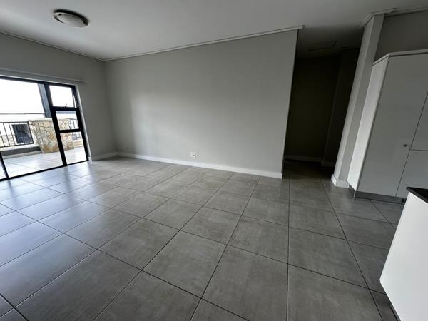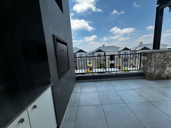 The apartment features a stylish open-plan kitchen fitted with integrated SMEG appliances, seamlessly flowing into a spacious living and dining area. Designed for effortless indoor-outdoor living, the home boasts a generous double balcony, partially covered for year-round use and complete with a built-in gas braai ideal for entertaining or relaxing while enjoying estate views.