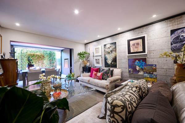 The dining space and living room are open to the contemporary kitchen. The enclosed patio area is accessible from the lounge area.