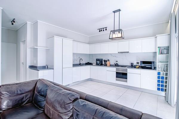 The spacious layout showcases a high gloss gourmet kitchen, beautifully illuminated interiors, and two lovely bedrooms. The main bedroom features an en-suite bathroom with attractive fittings, while the second bedroom is serviced by a separate bathroom.