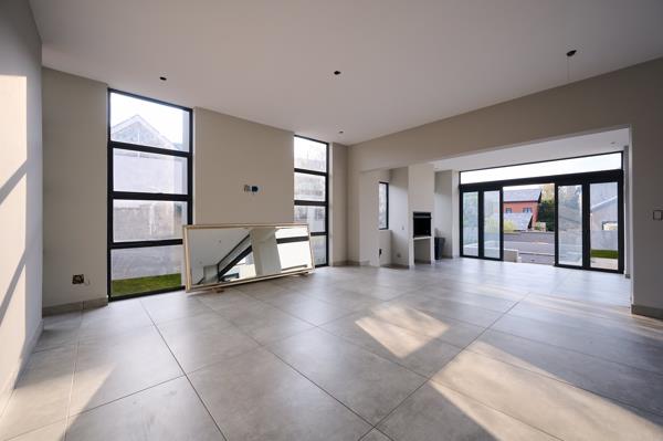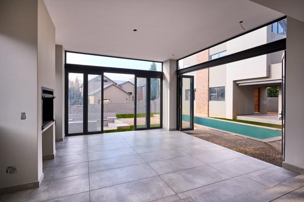 Outdoors, youll find an enclosed patio with stacking doors and built-in wood braai, a large pool (not yet completed), a boma/firepit area, and a generous garden ready for landscaping.
