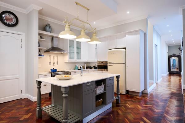 Twin double garages flank the portico entrance, which opens into a bright hallway overlooking a delightful courtyard garden, with glimpses of the pool beyond. The open plan living area begins with the stylish kitchen, centred around the island with prep sink. A gas SMEG cooker and built-in microwave nestle within the white cabinetry, while the separate scullery accommodates three appliances. The kitchen opens to a vine-covered pergola simply perfect for summery breakfasts. A few steps lead up to the dining area, which flows seamlessly to the inviting TV lounge. A Morso fireplace between the two rooms creates warmth and ambiance, while glass doors from the lounge open directly onto the enclosed patio.