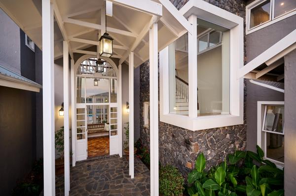The enclosed patio, with full height stacking glass doors on two sides, features a built-in wood braai, and overlooks the sparkling heated pool. Entertain year round with ease in this different and lovely space! The lush lawn and neat garden with automated irrigation connects the home with nature.