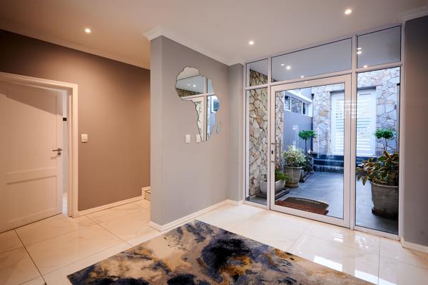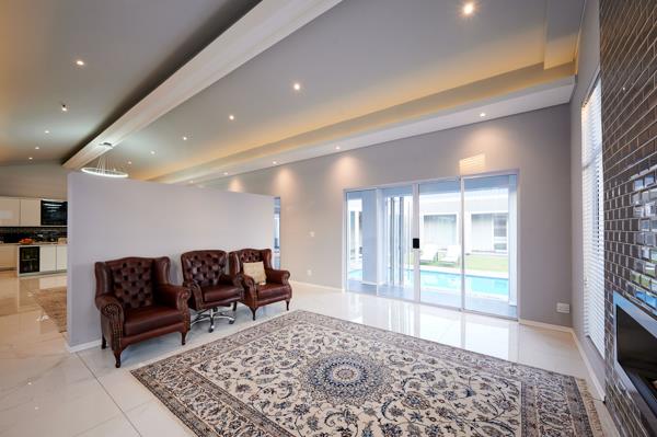 The entrance nestles between a double and single garage, with a rock feature wall that gives nothing of the interior away. Stepping inside, the cool and well-lit hallway leads into a vast, open plan living area that is bright and airy. The U-shape layout wraps around the inviting pool and garden, creating a seamless flow from indoors to out. To the right of the entrance, the dining room and formal lounge stretch out, with a pitched ceiling and gas fireplace in the lounge. Adjacent to the dining room, the modern kitchen dazzles in black and white, with glossy inset cabinets and stone counters, balanced by contrasting smoky glass cupboards. The central island houses the gas hob and induction plate, with built-in microwave, oven and integrated fridge and freezer within the cabinetry. The large, walk-in pantry is a delight, in the separate scullery.