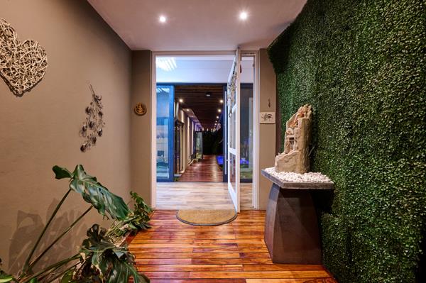A double volume room with a lofty pitch and cascading chandelier opens to a covered patio, offering a variety of options to use as a breakfast room or open plan study. The impressive formal lounge, featuring a wood burning fireplace, flows into the enclosed patio-style dining room. This vast entertainment space opens to the deck, the inviting heated pool and resort style gazebos with rattan couches. A low wall separates the garden from the greenbelt, creating a feeling of limitless space extending into nature. The dining area backs onto another room with a fully fitted bar and TV lounge/games room, perfect for relaxation and entertainment. From the bar, another covered patio awaits, complete with gas braai and gas hob, stepping down to a boma with deck seating and a gas fireplace.