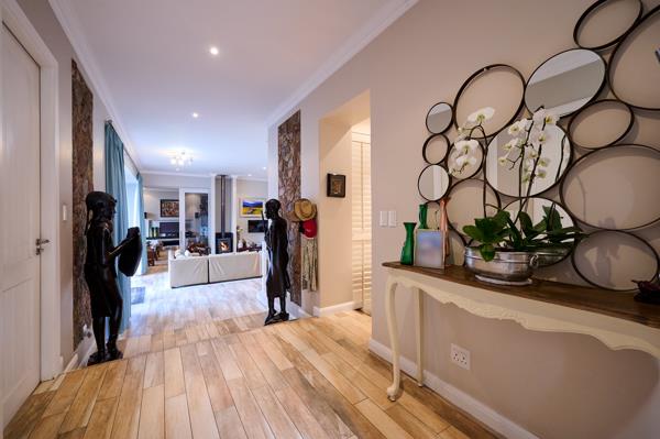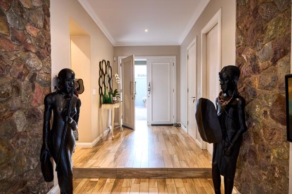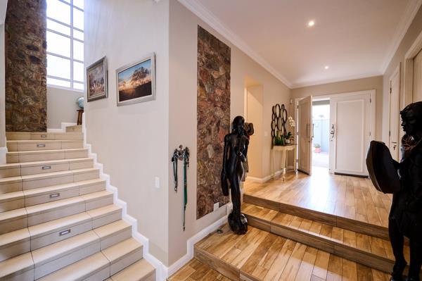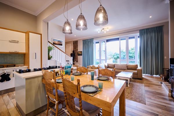 Entertaining is effortless in the expansive family room with built-in wood braai and bar, seamlessly integrated with the dining area. A cosy lounge with a wood fireplace connects to the open patio and pool deck. A pajama lounge upstairs offers the perfect retreat and can double as a study.