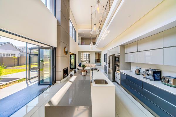 The heart of the home beats with elegance in the wine cellar, where your most treasured vintages await their moment. An enclosed bar area and formal lounge provide perfect settings for entertaining, while the open-plan kitchen boasts state-of-the-art AEG appliances, a separate scullery, and a gas fireplace that adds warmth to every meal. The dining room and TV lounge flow seamlessly from the kitchen, with stack doors opening to a covered patio. Here, a built-in braai and sink overlook the serene pool and boma area, inviting endless days of relaxation and entertainment under the African sky.