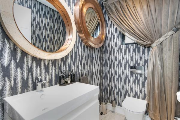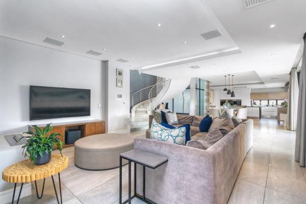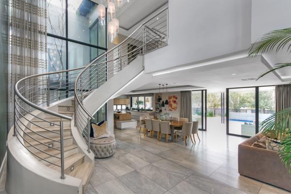 A manicured, covered stepping-stone pathway framed by a striking stone-clad accent wall leads you to a grand, metal-framed glass front door. Step inside and be greeted by a breathtaking double-volume entrance hall, where a sweeping spiral staircase commands attention as the centrepiece. From the moment you enter, the uncompromising quality of fittings and finishes is evident, setting this home apart as a true showpiece.