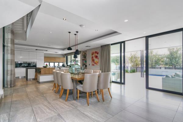Descending into the fully tiled, open-plan entertainment spaces encompassing the kitchen, dining area, and family lounge your gaze is immediately drawn to expansive glass sliders that open seamlessly to an impressive, year-round entertainment haven. The covered patio, complete with remote-controlled drop-down sun blinds, offers a built-in gas fireplace, generous seating, and views of the sleek, elongated pool with composite decking. An adjoining fully equipped bar area boasts premium fridges, large prep bays, and a built-in gas braai the ultimate setting for hosting unforgettable gatherings. Beyond lies a lush, established garden with expansive lawn and mature trees for the whole family to enjoy.