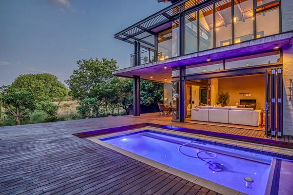 Expansive open-plan living areas flow effortlessly between the lounge, dining space, and contemporary kitchen featuring a gas hob and walk-in fridge. Large glass doors open onto a wooden deck and patio with a built-in braai, pizza oven, and refreshing pool perfect for effortless entertaining and relaxed outdoor living.