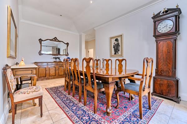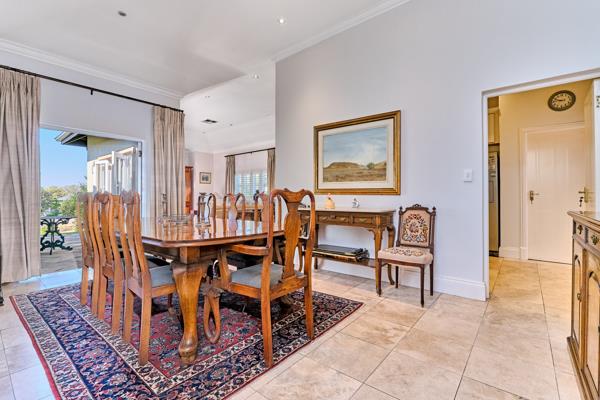 Step inside and be welcomed by a generously proportioned living room, which flows into an expansive dining area ideal for hosting elegant dinner parties. The well-appointed kitchen, tucked just off the dining space, includes a separate scullery and a walk-in pantry, creating both functionality and flow.