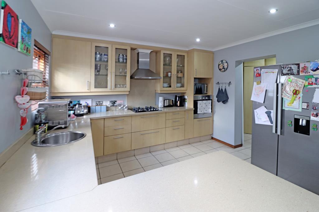 Living and entertainment space comprises a beautiful open plan space, with kitchen, lounge and dining room all opening out to the patio and patio extension. Covered patio offers a built-in braai overlooking the sparkling pool and garden. Large gourmet kitchen with gas hob, space for a double door fridge, breakfast bar, pantry and separate scullery.