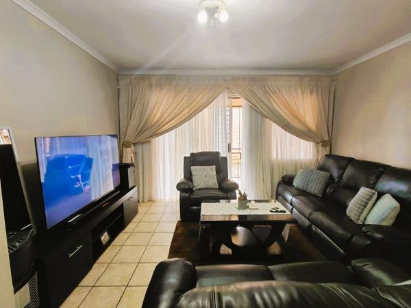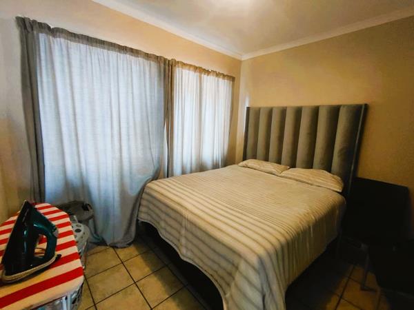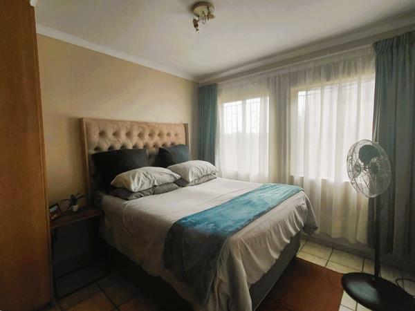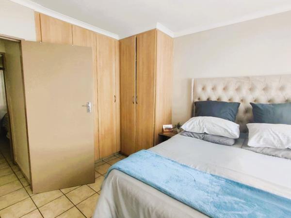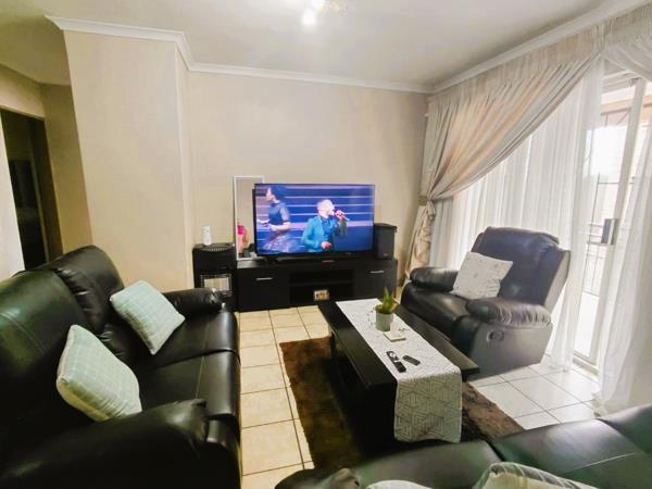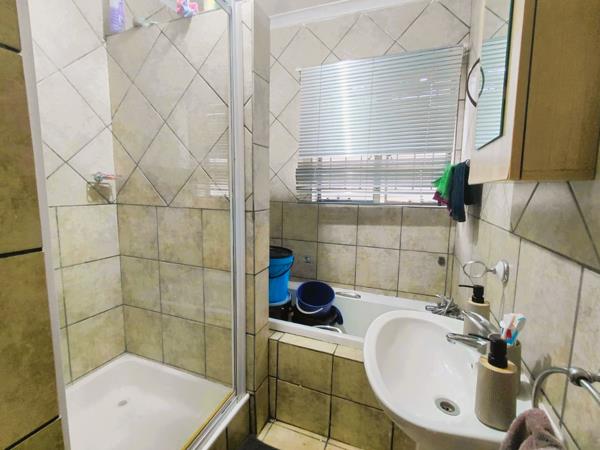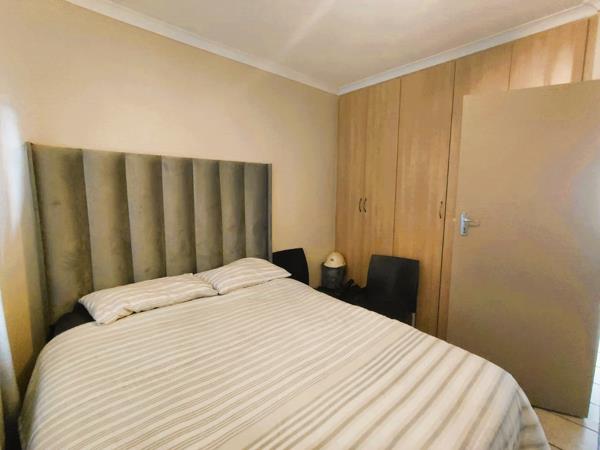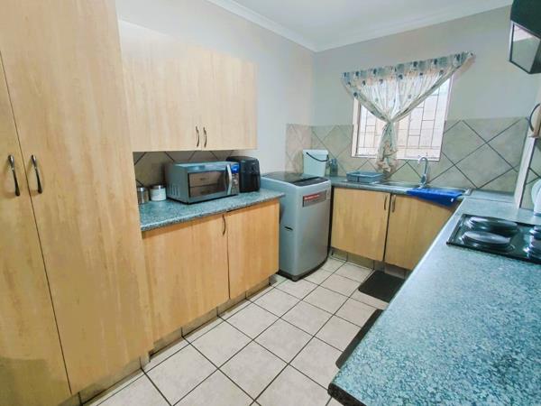 Two bedroom sectional title apartment for sale. The kitchen features built-in cupboards and a built-in stove. The living area is spacious and opens onto a private patio. Both bedrooms are well sized. The bathroom includes a shower, bath and basin, with a separate toilet.