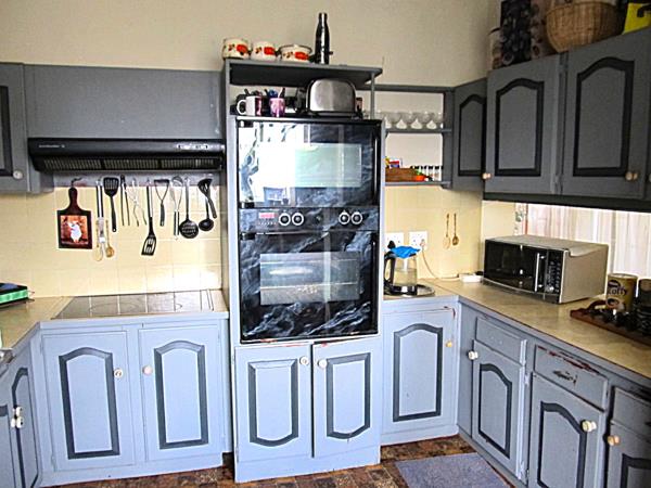 Kitchen has ample cupboard space with eye level oven and double basin.
