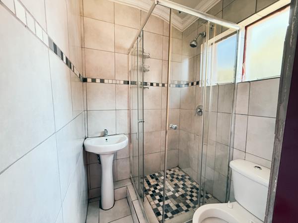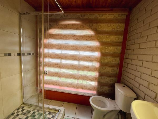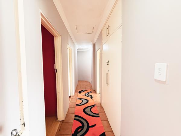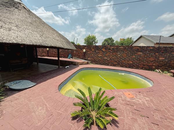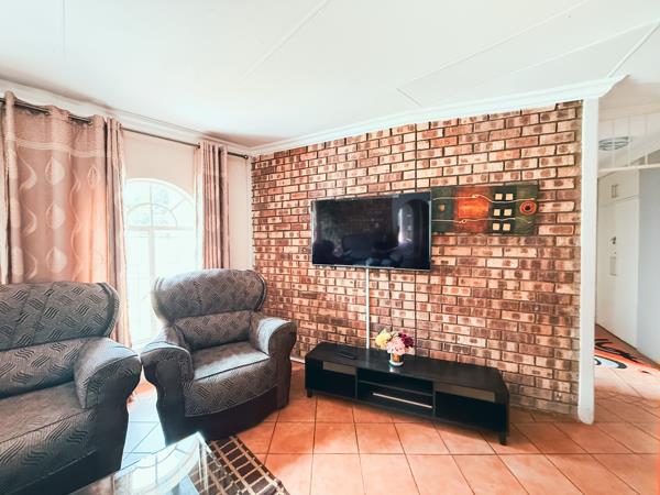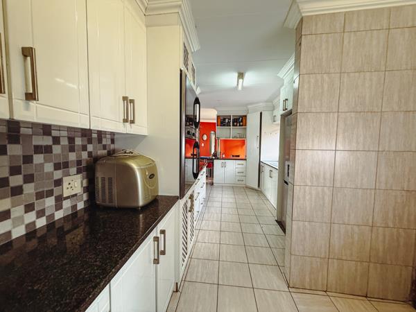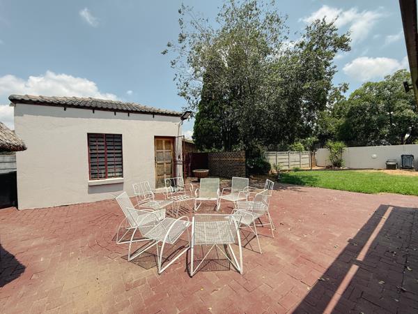 The outdoor area features a beautifully maintained garden with a swimming pool and an entertainment lapa with fireplace and built-in braai, perfect for hosting all year round.