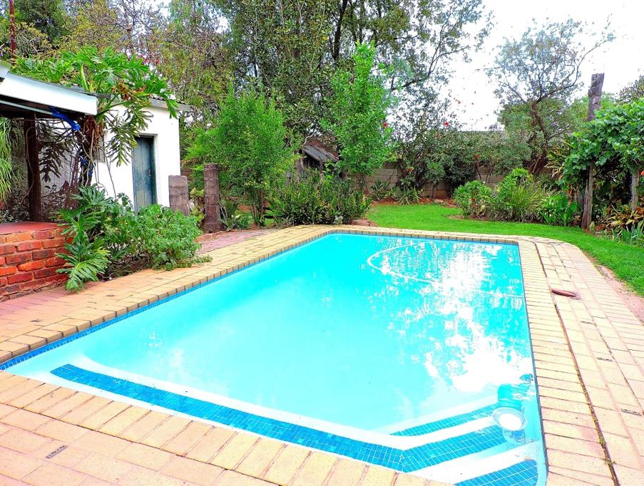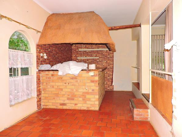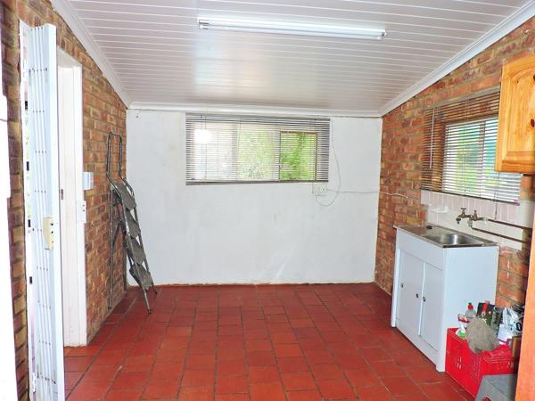 Kitchen features solid oak wooden cupboards, a double eye-level oven and a built-in hob. A scullery and laundry area leads from the kitchen. There is also an additional entertainment area with easy access to the covered built-in braai and swimming pool area.